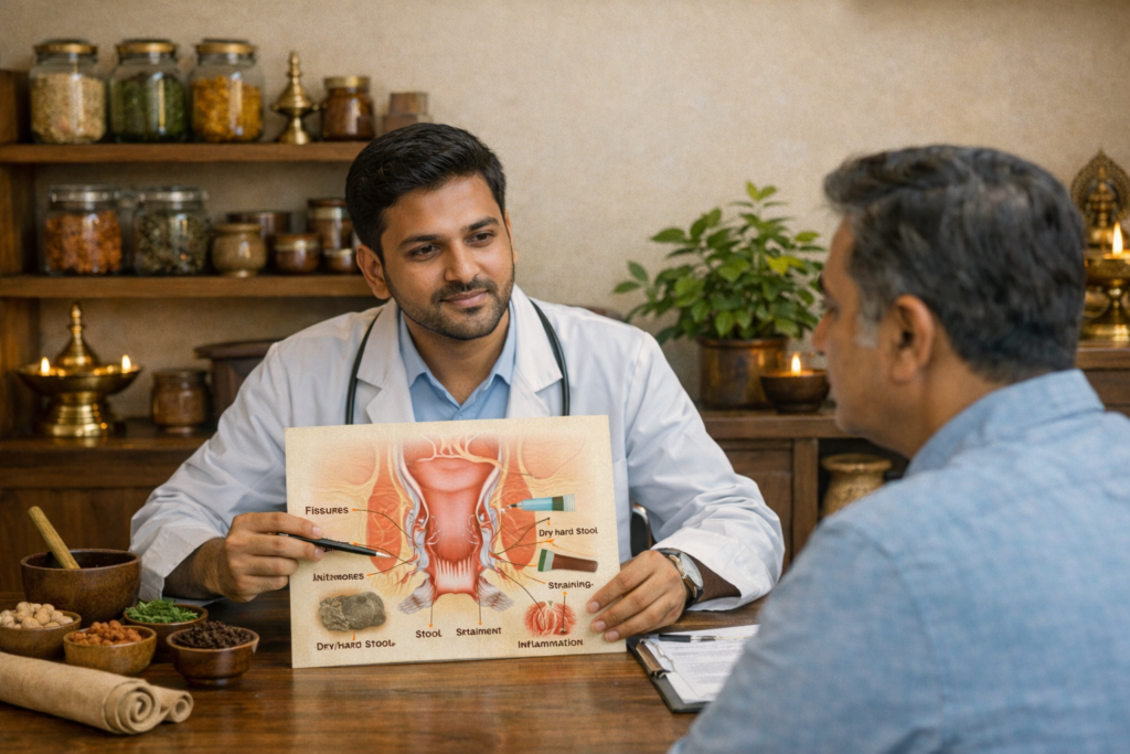Ayurveda treats fissure by softening stools, healing the tear, reducing pain and spasm, and restoring normal bowel rhythm to prevent recurrence.