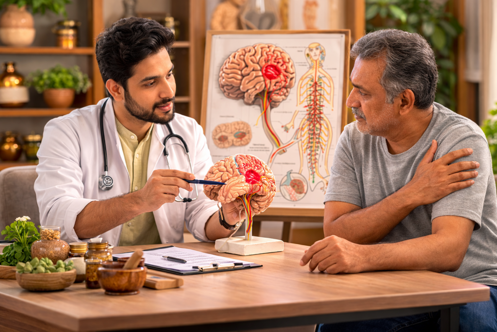 Ayurveda supports stroke recovery by improving circulation, strengthening nerves and muscles, enhancing digestion, and supporting gradual functional improvement.